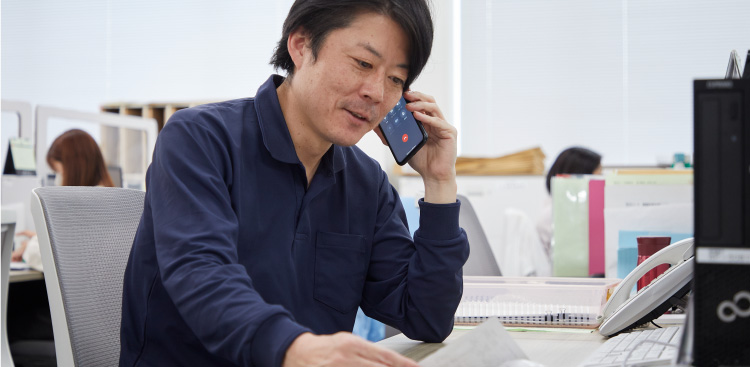 品質向上、生産調整、コストの低減、新素材のご提案など、営業と現場をつなぐ重要な役割を担っています。また、お客様の生産ラインで発生している不具合などのお困りごとは、現地にて「立会い調査」・「改善提案」・「テスト印刷」を行い、問題の解消をして参ります。