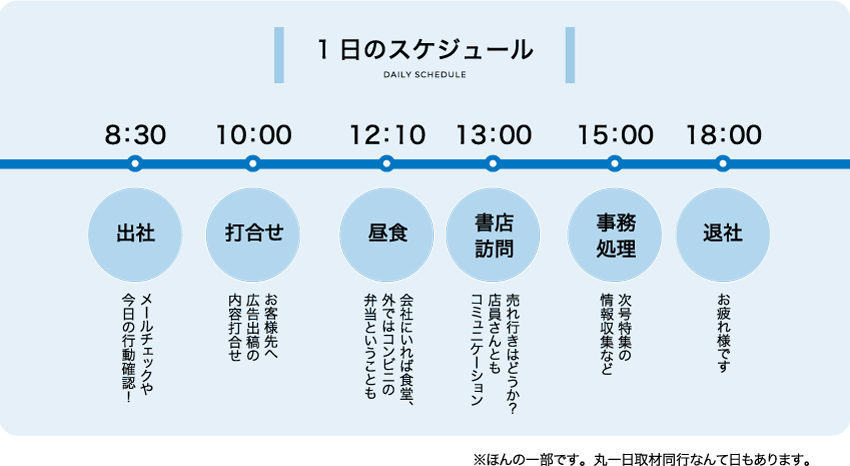 特集テーマに基づき広告出稿頂けるクライアントとの商談を行います。時には記事広告の内容についての相談にものっています。書店さんとのコミュニケーション作りがメイン。売れ行きの確認や、本の配置変更依頼など行います。