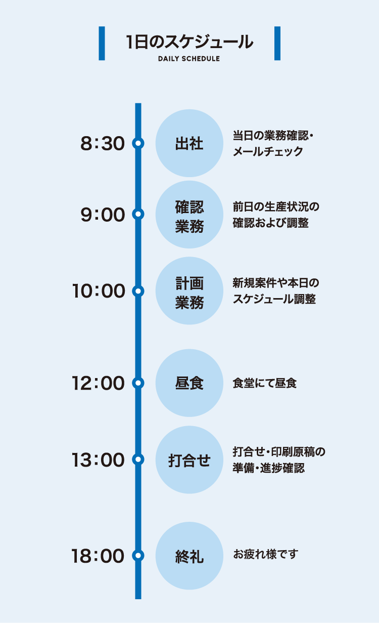 - 現在は、生産管理課でお客様からの注文や納期に合わせて生産スケジュールを作成し、製造工程や営業と調整を行ったり、“製造プロセスの効率化”を目的とした生産ラインの改善を進め、コスト削減や生産性向上にも取り組んでいます。