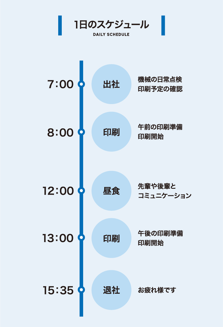 - 印刷課として、ロール印刷機のオペレーターをしています。版やインキの準備、印刷の位置合わせ、印刷チェック、製品印刷が主な業務になります。印刷している最中は、検査機を確認し、不具合があれば対処しています。